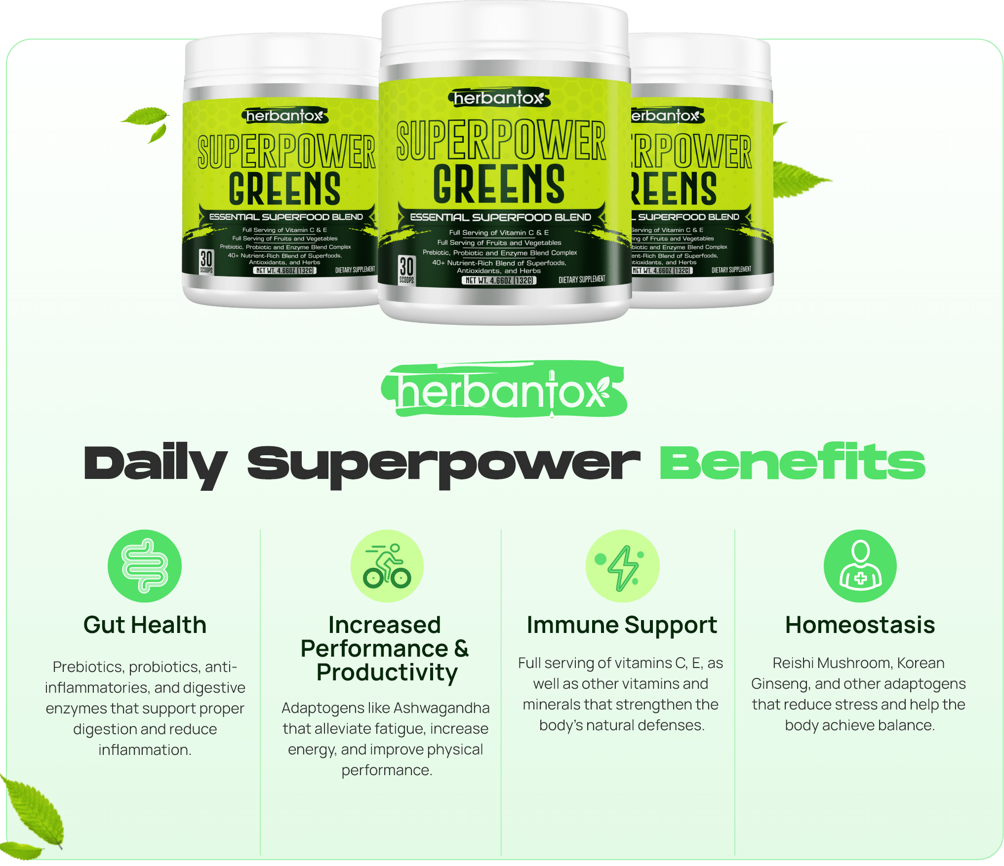 Superpower Greens includes adaptogenic mushrooms and herbs that help our body to respond to physical, biological, and chemical stresses by increasing the body’s resistance to stress. These adaptogens create an environment where the body functions normally during a time of stress, promoting recovery and stability in the body.