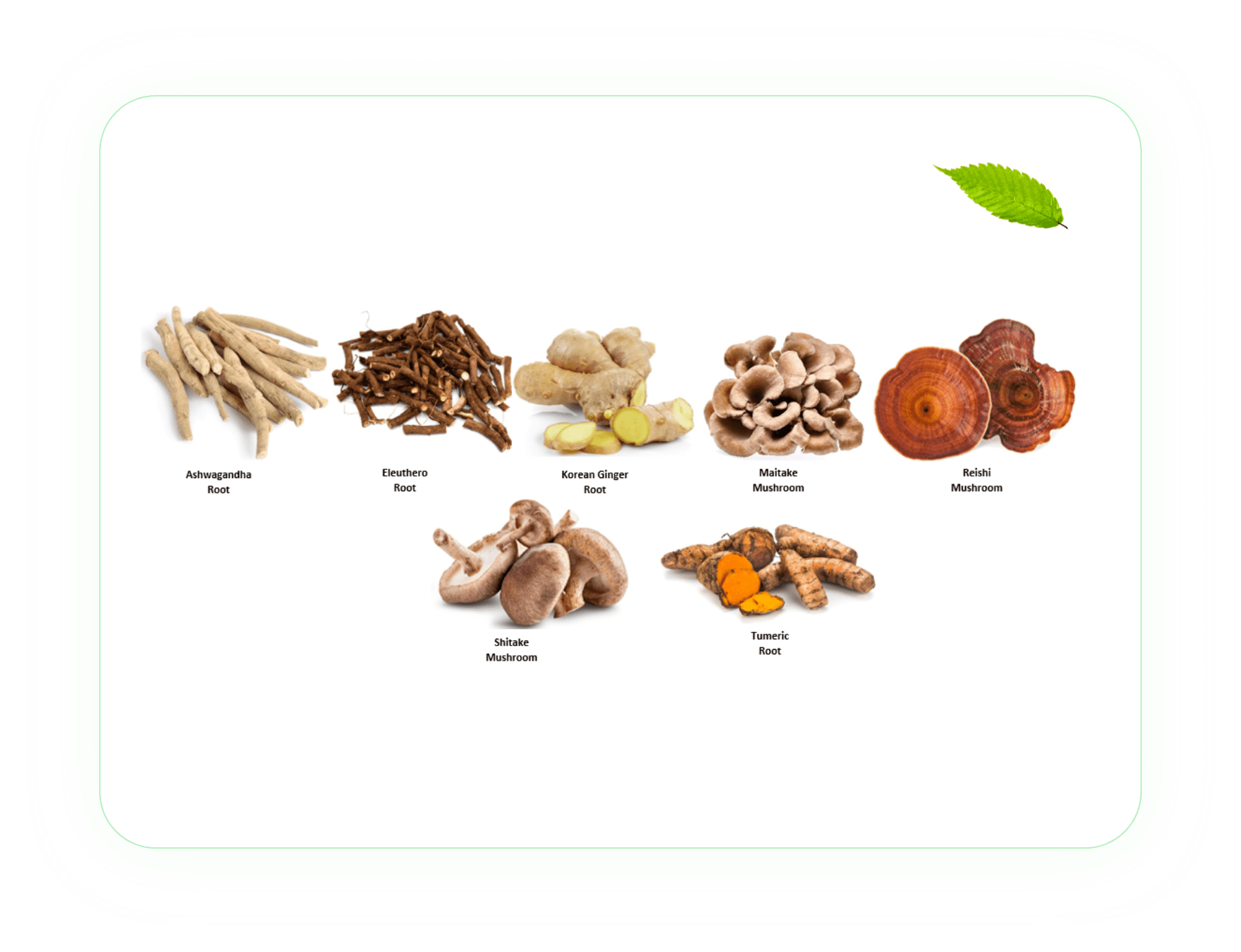 Ashwagandha Root, Eleuthero Root, Korean Ginger Root, Maitake Mushroom, Reishi Mushroom, Shitake Mushroom, and Tumeric Root.