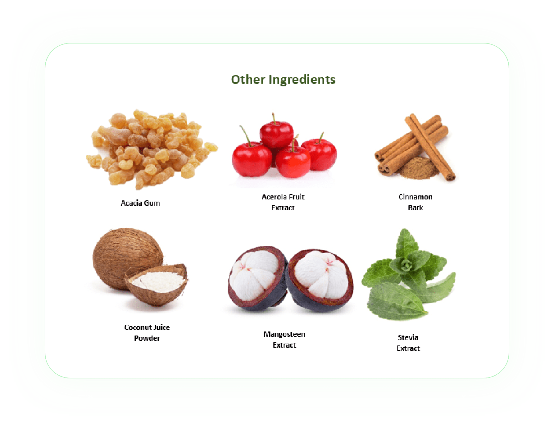 Acacia Gum, Acerola Fruit Extract, Cinnamon Bark, Coconut Juice Powder, Mangosteen Extract, and Stevia Extract.